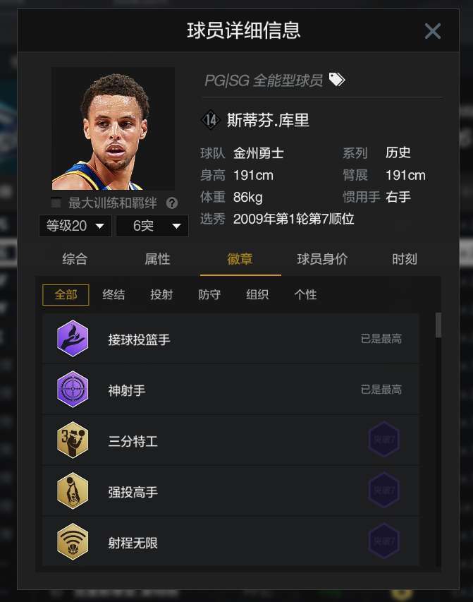 ✨NBA2KOL2 4.38亿爽玩号,6突满训库里(2紫6金投射徽章全覆盖),5大帅,6鸭梨。
